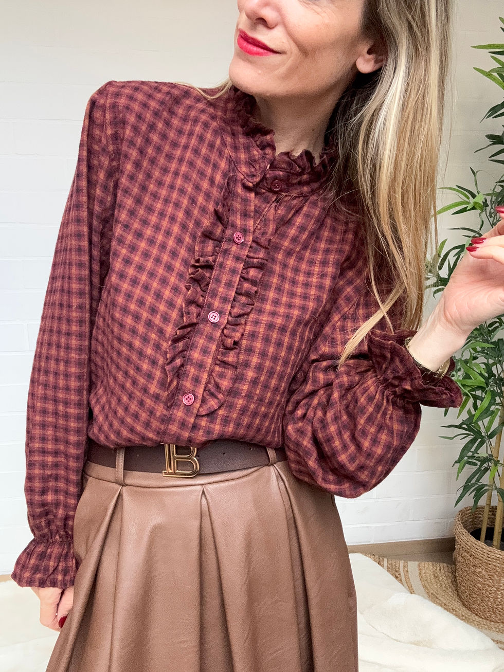 Trendy en toch vrouwelijk: deze bordeaux bloes in PU-leer met zachte voering voelt aangenaam aan en oogt luxueus. De kortere lengte geeft extra elegantie, en het 1 maat-model past mooi tot maat 40-42.